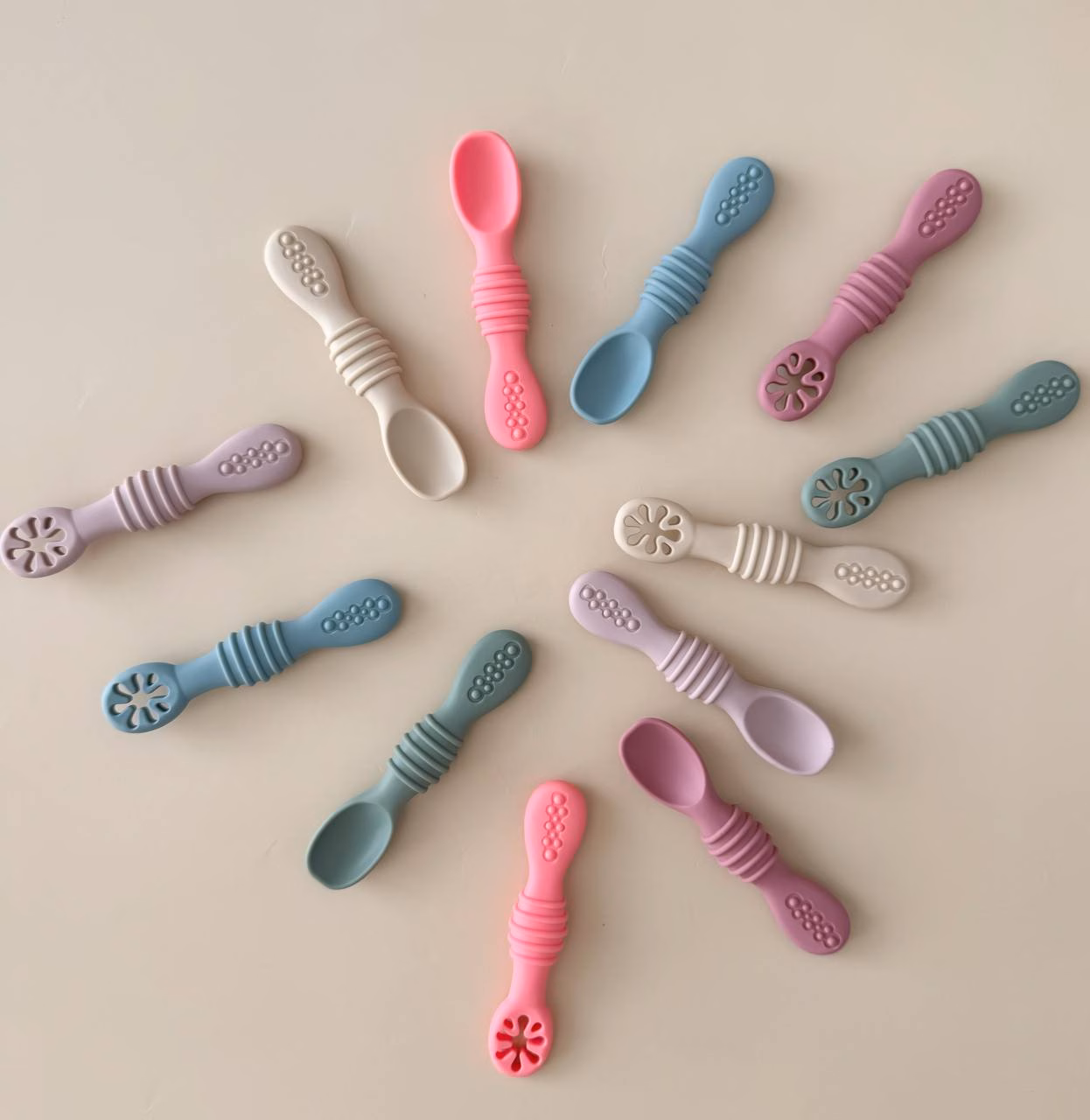 - Lame disain tagab, et lusikaid saab haarata igas suunas, mis teeb nende kasutamise väikeste käte jaoks lihtsaks ilma randme pööramiseta.