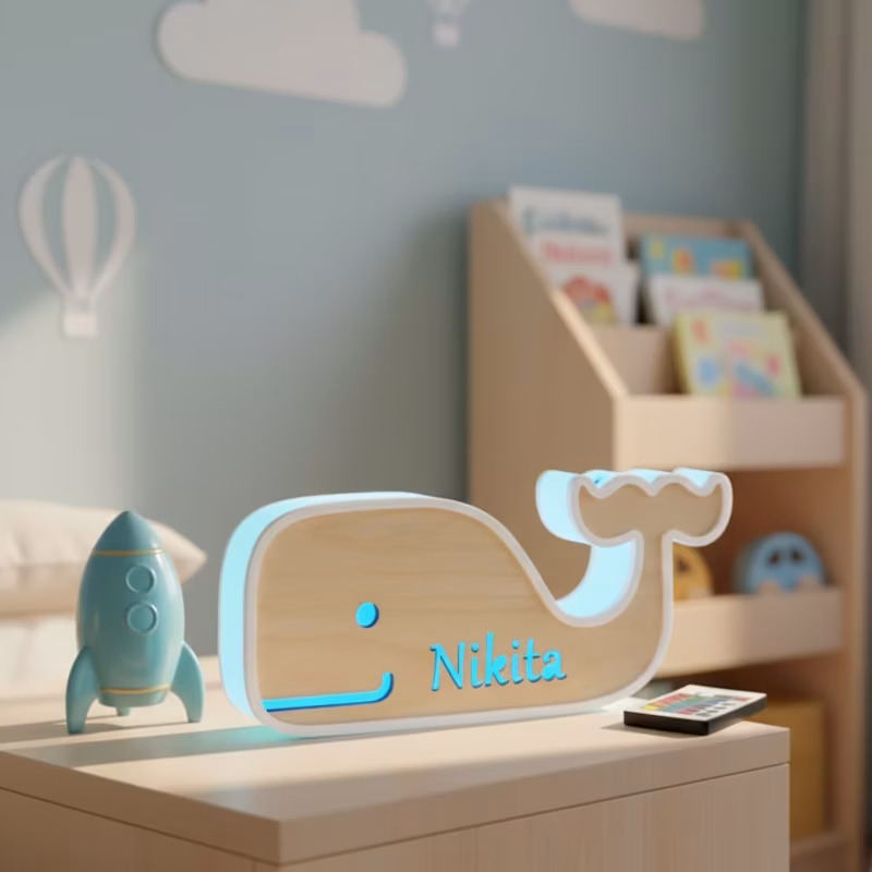 Personaliseeritud laste öölamp – vaal, millele saame lisada Teie armsa lapse nime! See on täiuslik viis muuta magamaminek maagilisemaks ja unustamatuks.