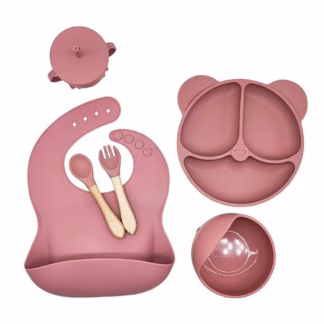 Laste sööginõude komplekt silikoonist 6-osaline – tumeroosa
